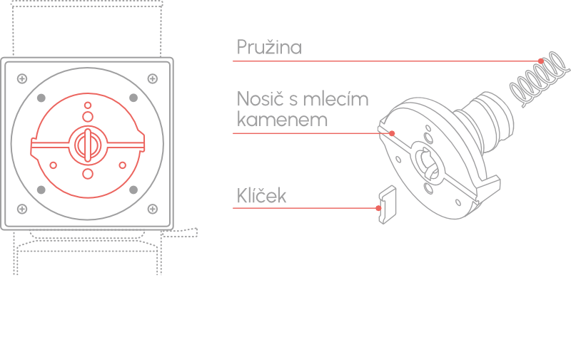 • Vyjměte klíček, vyberte nosič mlecího kamene se šnekem, vyjměte pružinu